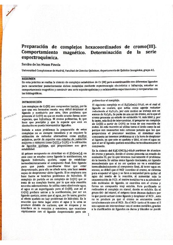 Cuaderno detallado y corregido de las practicas de inorganica II de UNIZAR