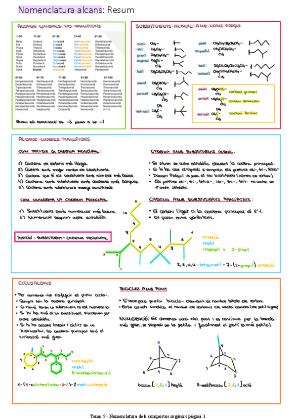 Resum de nomenclatura d'alcans lineals no ramificats, ramificats i de cicloalcans (bicicles).