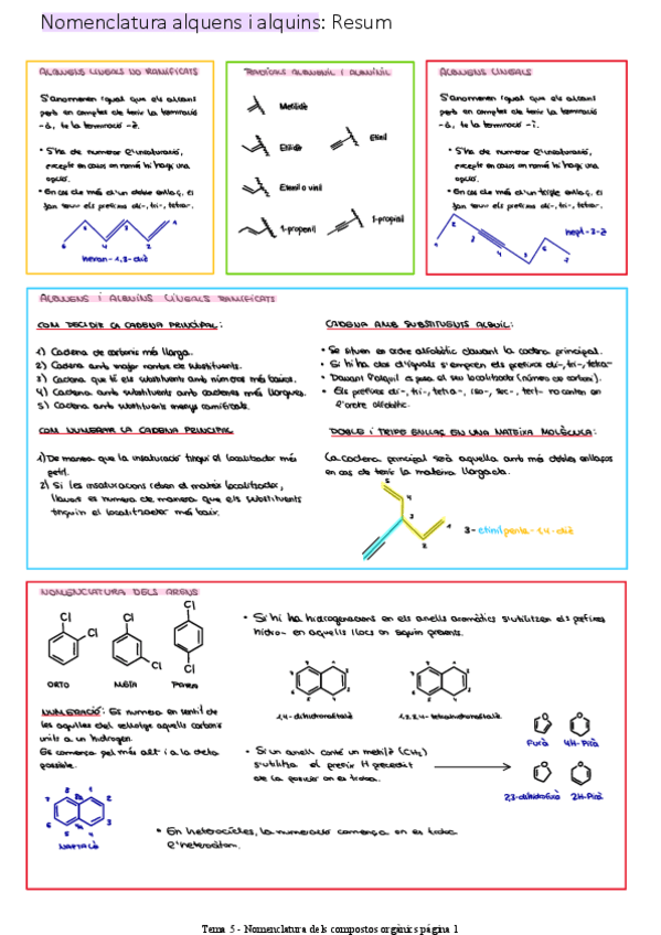 Resum nomenclatura alquens i alquins lineals, ramificats i arens (molècules aromàtiques)
