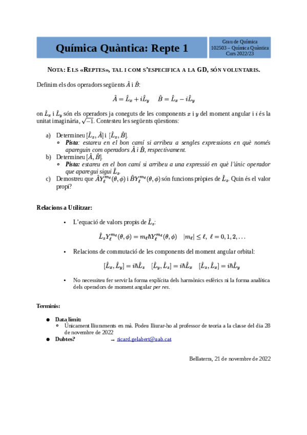 He publicado nuevos ejercicios de 2º Química Quàntica: Repte-1-2022-2023.pdf