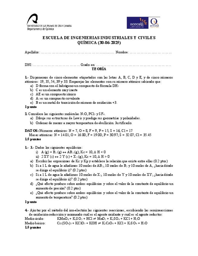 He publicado dos exámenes de Química para que practiquéis