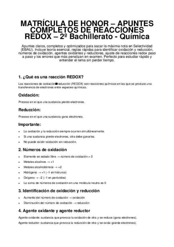 Teoría clara de redox Números de oxidación Agente oxidante / reductor Método ion-electrón Errores típicos de selectividad Frases clave para memorizar