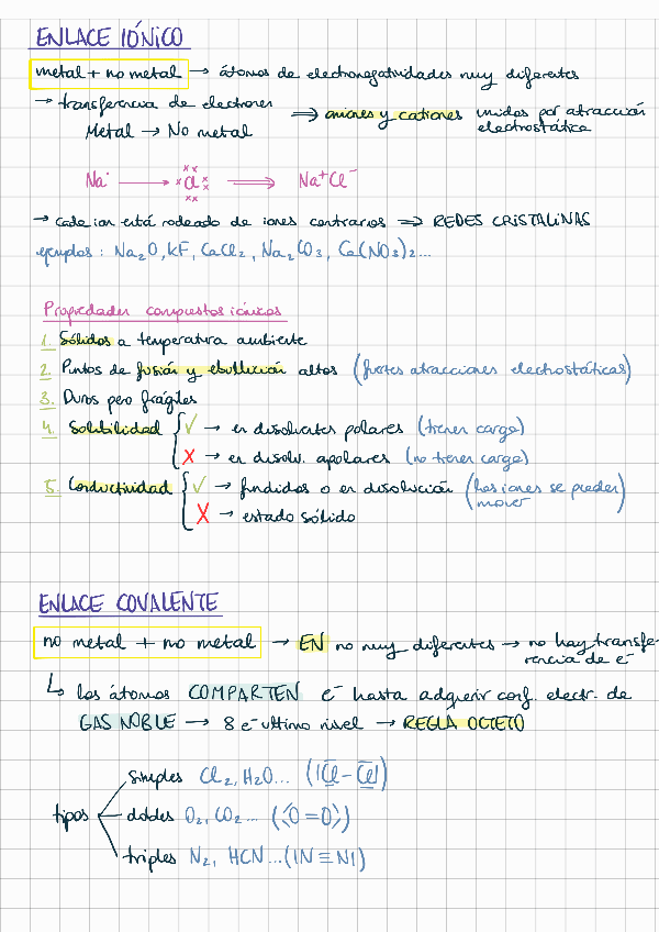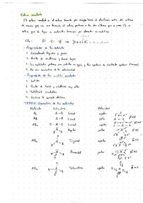 Resumen de enlace químico hecho a mano en una página.