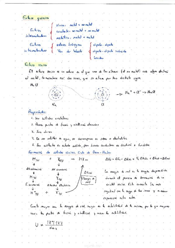 Resumen de enlace química (iónico, covalente, metálico y fuerzas intermoleculares). Con cuestiones.