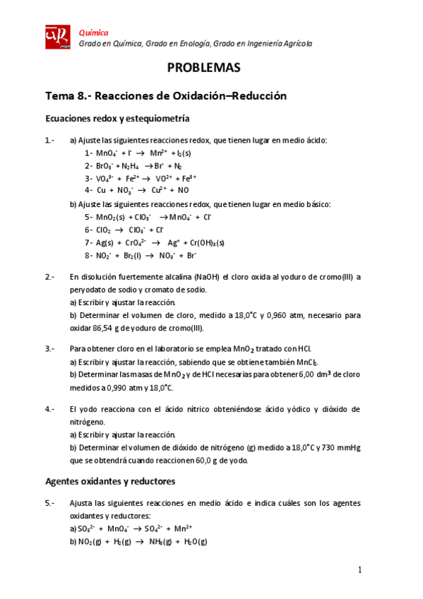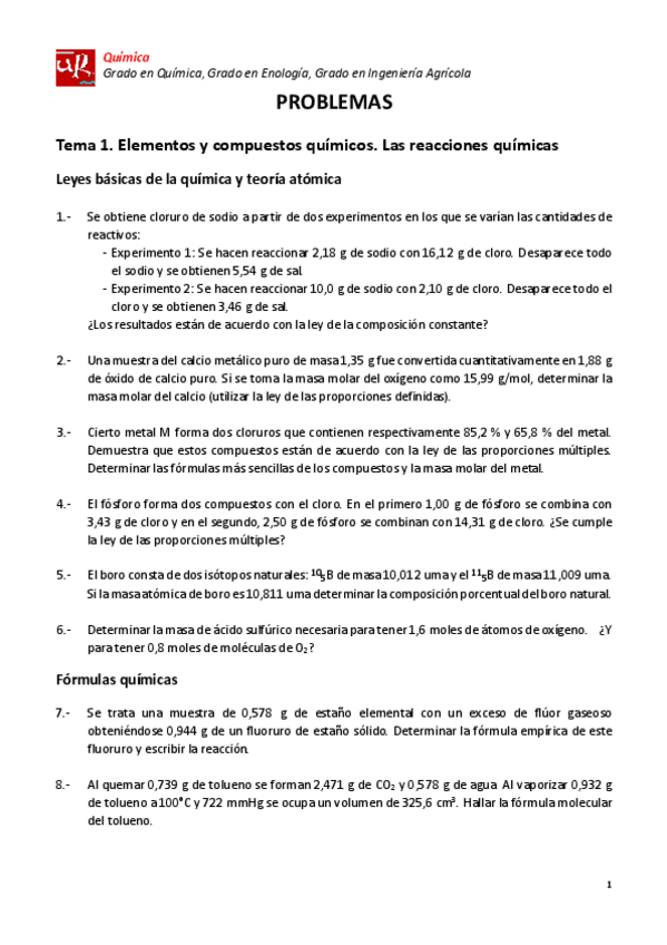 He publicado nuevos apuntes de 1º Química: Problemas química (enunciados)