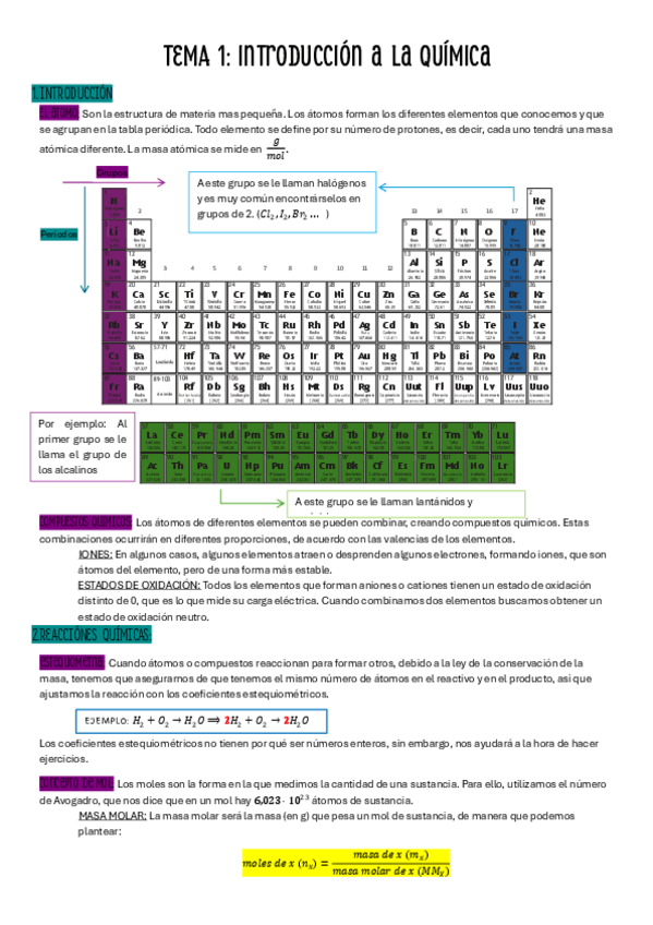 Índice: Introducción (el átomo y uso de la tabla periódica), estequiometría, concepto de mol, uso de la ley de los gases ideales, reactivos en exceso y limitantes
