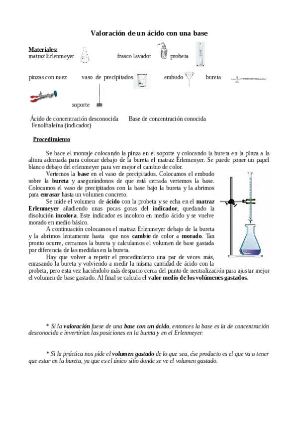 Práctica de laboratorio: valoración ácido-base. Materiales y procedimiento