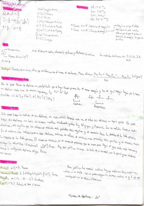 Apuntes muy útiles que me ayudaron a sacar química y la PAU de la mejor forma. Incluye las fórmulas para hacer problemas de ondas, explicación del principio de exclusión de Pauli, números cuánticos y definiciones muy importantes en la Pau de Energía de Io