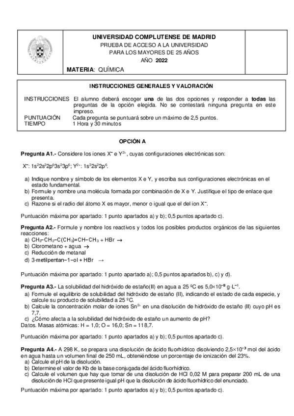 Ejercicios EQUILIBRIO QUÍMICO Y SOLUBILIDAD. Prueba acceso mayores de 25. URJC.