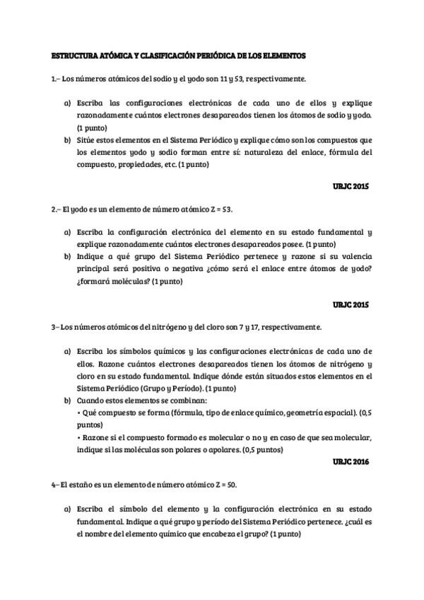 Ejercicios estructura atómica, molecular y clasificación periódica resueltos. Prueba mayores 25 URJC