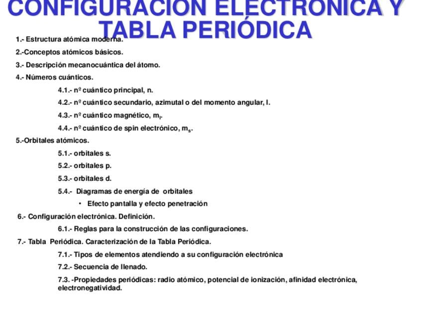 Temario de Estructura atómica, Configuración electrónica y Tabla periódica