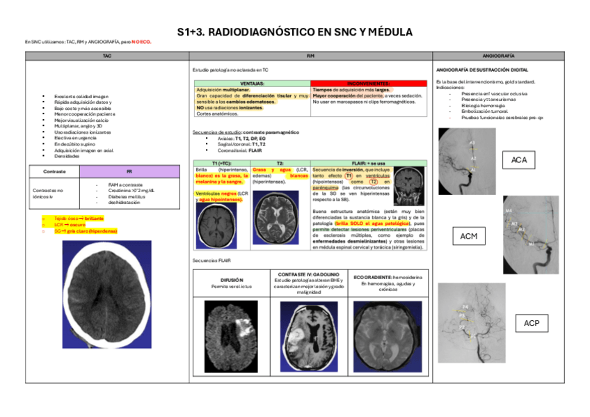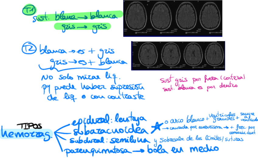 Clave para diferenciar T1 y T2 en RM. Y resumen hemorragias cerebrales.