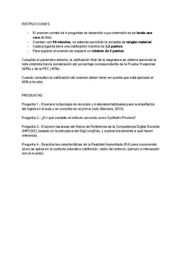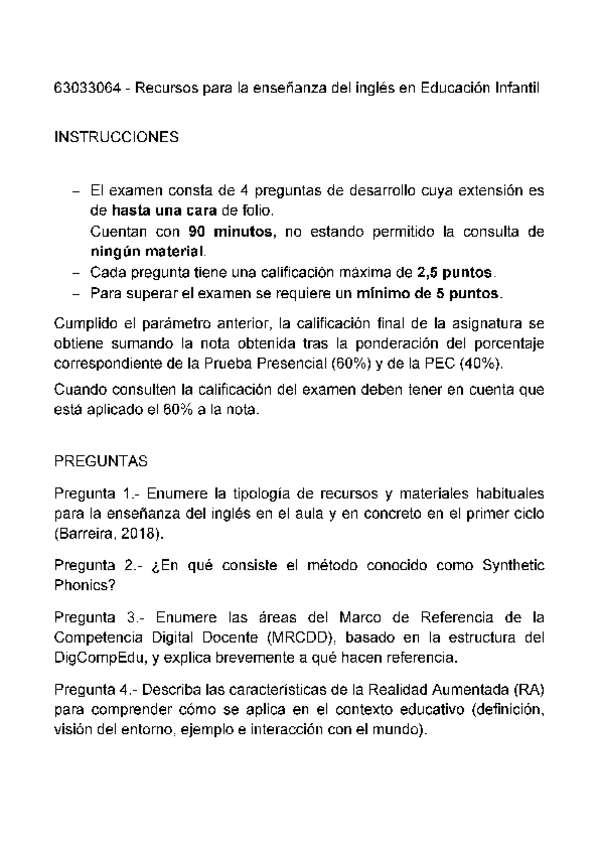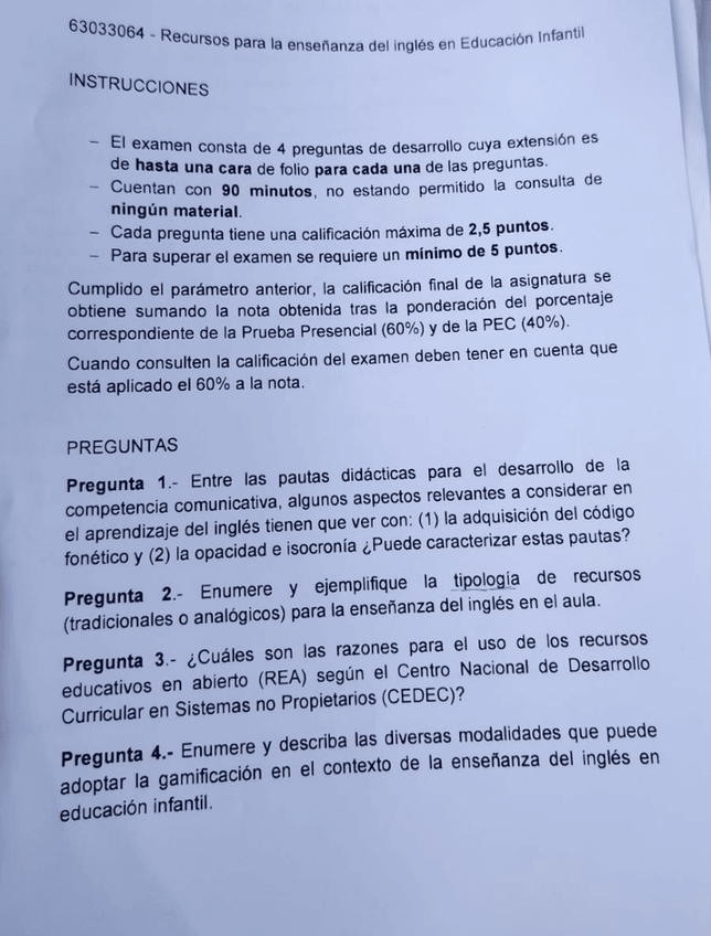 Examen de la asignatura "Recursos para la Enseñanza del Inglés en EI" (primera semana, mayo 2025)