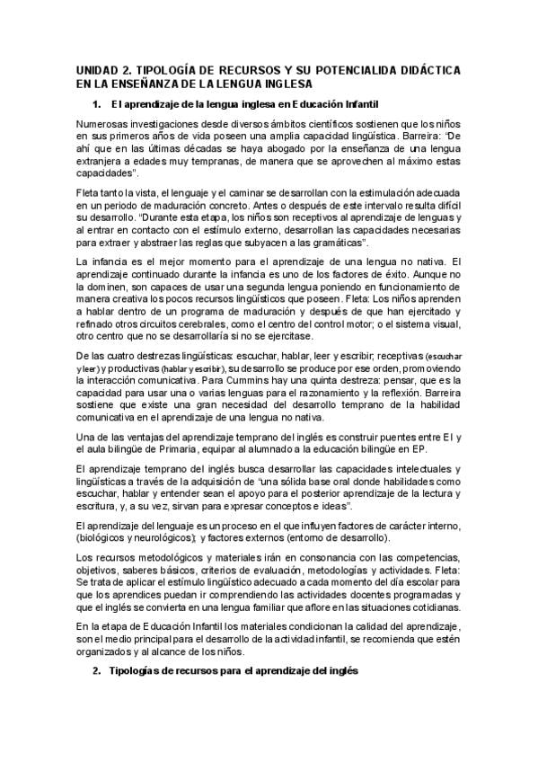 Resumen TEMA 1 - RECURSOS PARA LA ENSEÑANZA DEL INGLÉS EN E.I. (UNED) - APUNTES + GLOSARIO/VOCABULARIO + AUTOEVALUACIÓN