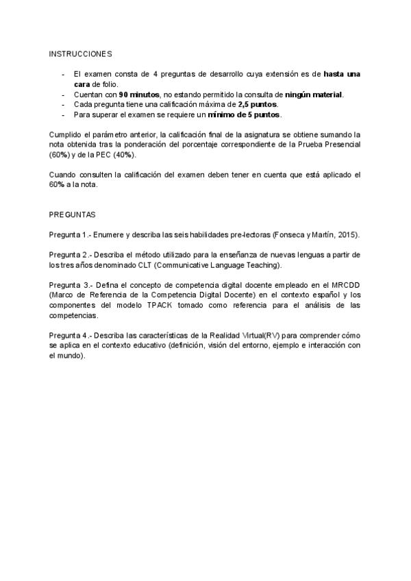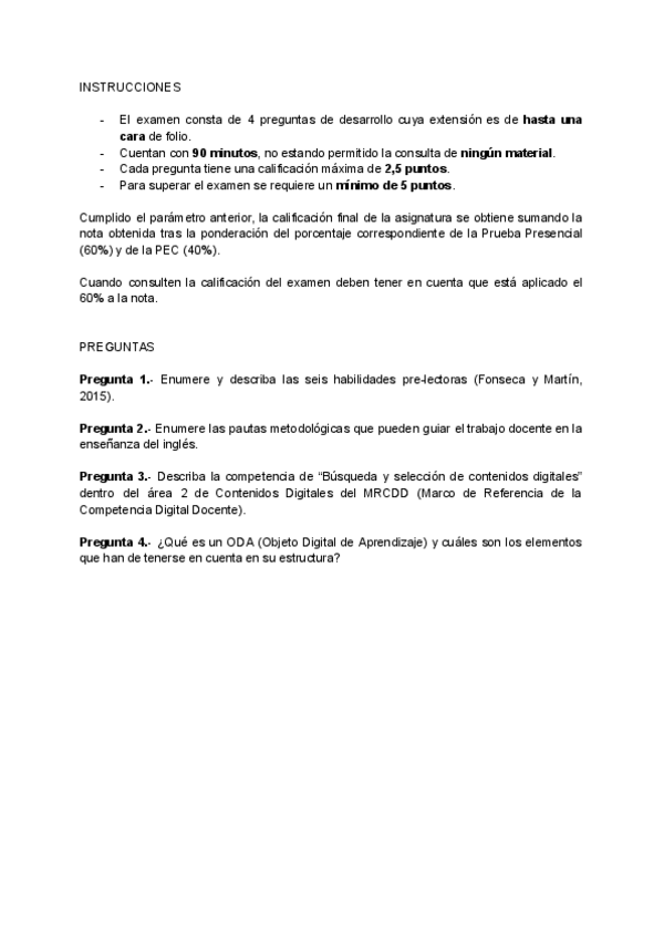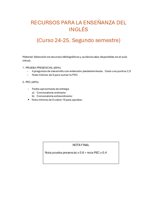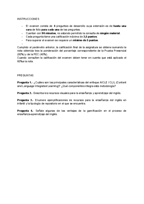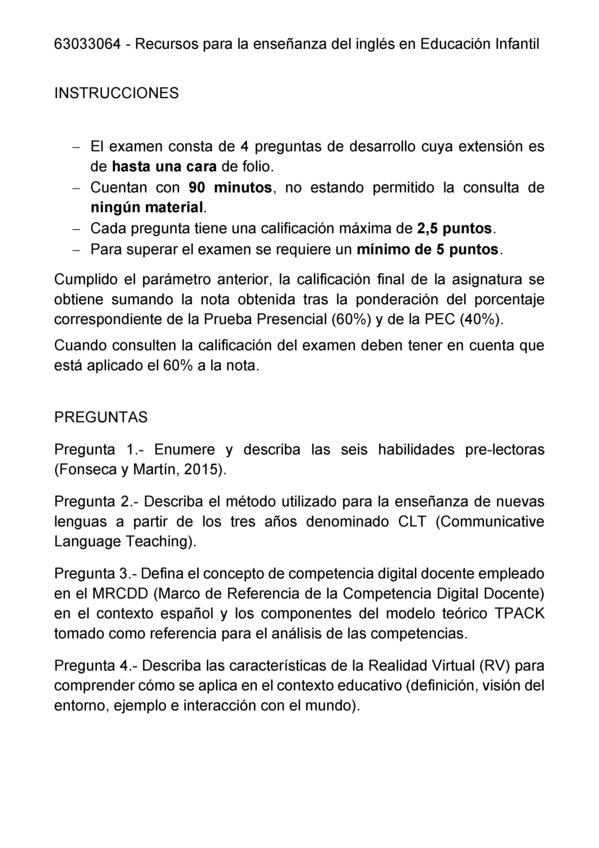 Examen de la asignatura "Recursos para la Enseñanza del Inglés en EI" (primera semana, mayo 2025)