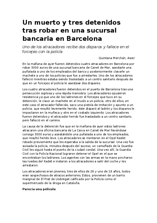He publicado nuevos apuntes de 1º Redacción informativa: Un muerto y tres detenidos tras robar en una sucursal bancaria en Barcelona.docx