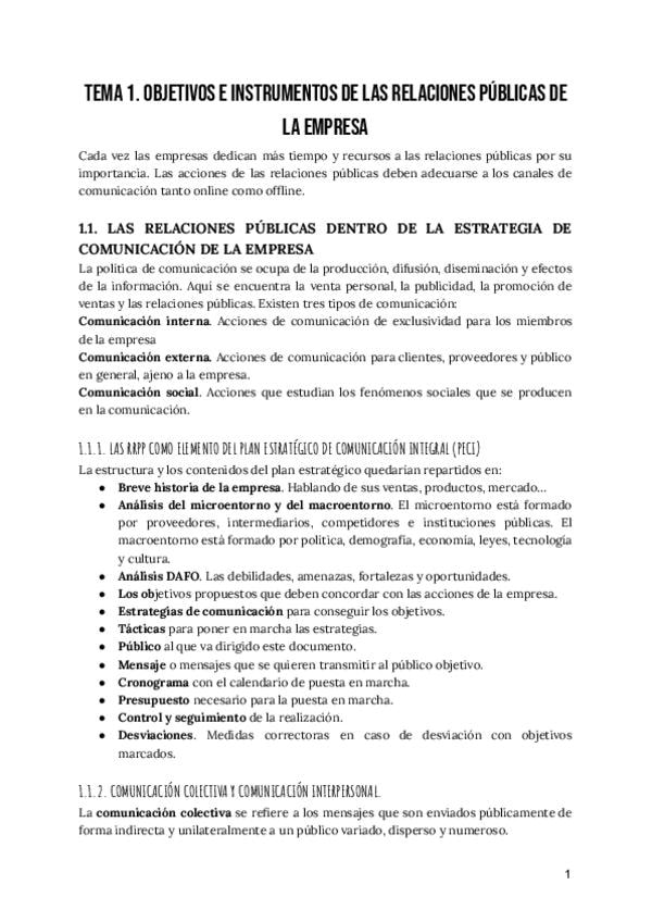 Resumen del tema 1 de RRPP: OBJETIVOS E INSTRUMENTOS DE LAS RELACIONES PÚBLICAS DE LA EMPRESA y tipo test de repaso