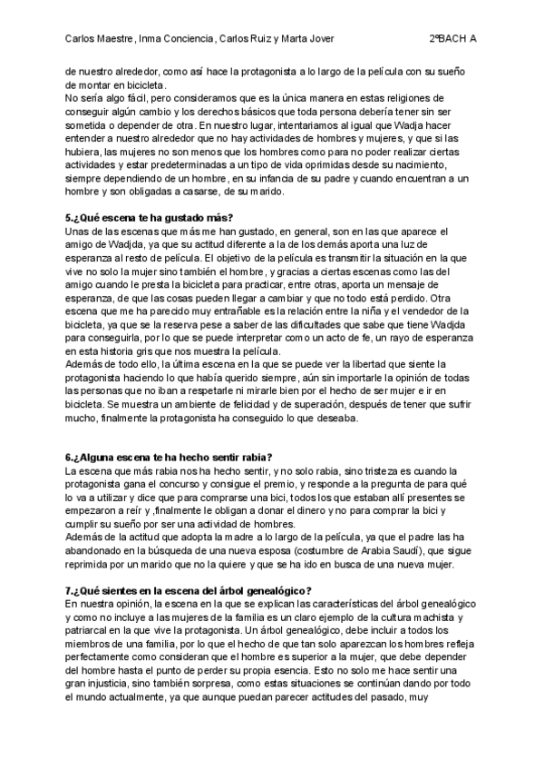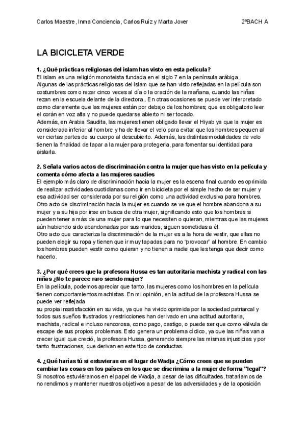 PREGUNTAS SOBRE LA PELÍCULA "LA BICICLETA VERDE" CON RESPUESTAS RELIGIÓN 2 BACH
