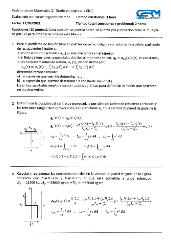 He publicado nuevos examenes de 2º Resistencia de Materiales: junio-2021CuestionesProblema-2Parcial-Resistencia.pdf