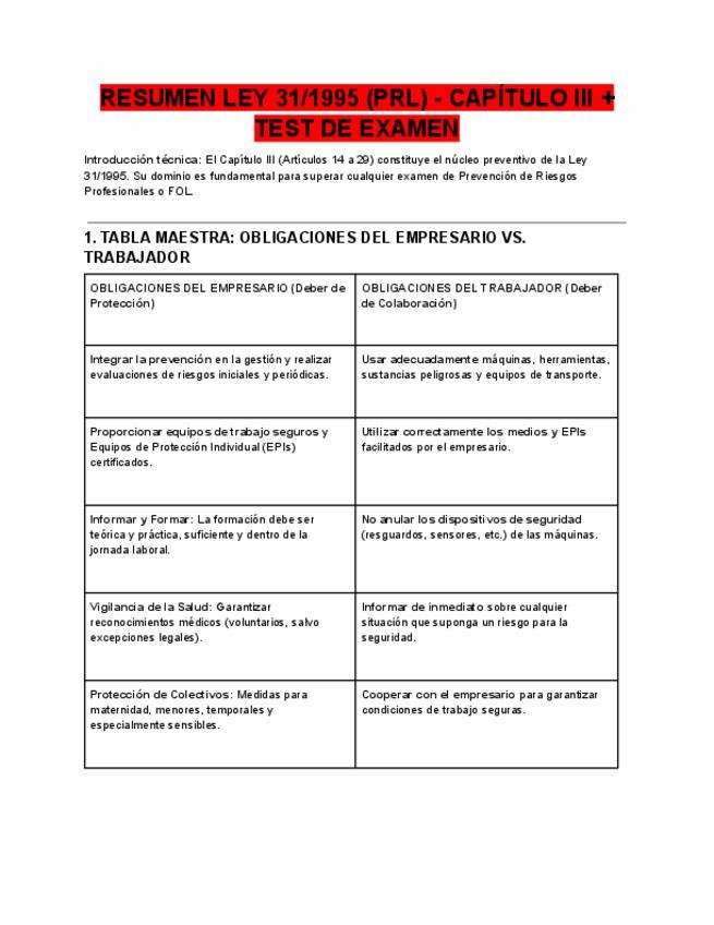 Esquema ultra-resumido del Capítulo III de la Ley de Prevención de Riesgos Laborales. Incluye tabla comparativa de obligaciones (Empresario vs Trabajador), explicación del Artículo 21 (Riesgo grave e inminente) y 5 preguntas tipo test con soluciones expli
