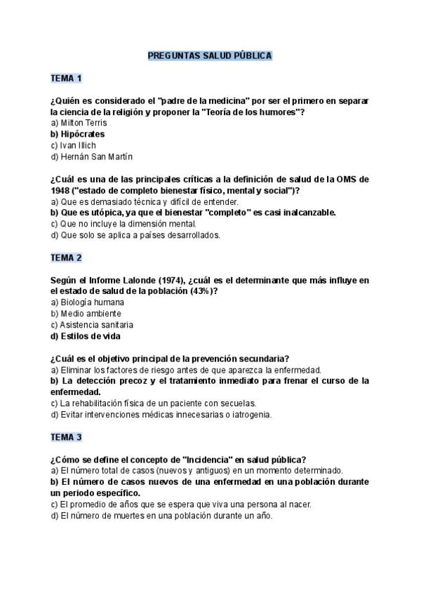 Preguntas de Salud Pública 1º de Enfermería (todos los temas). Hay dos preguntas por cada tema y viene corregido.