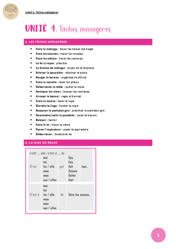 Vocabulaire: les tâches ménagères. Grammaire: La mise en relief, Exprimer une restriction et Donner des conseils (+subjonctif)