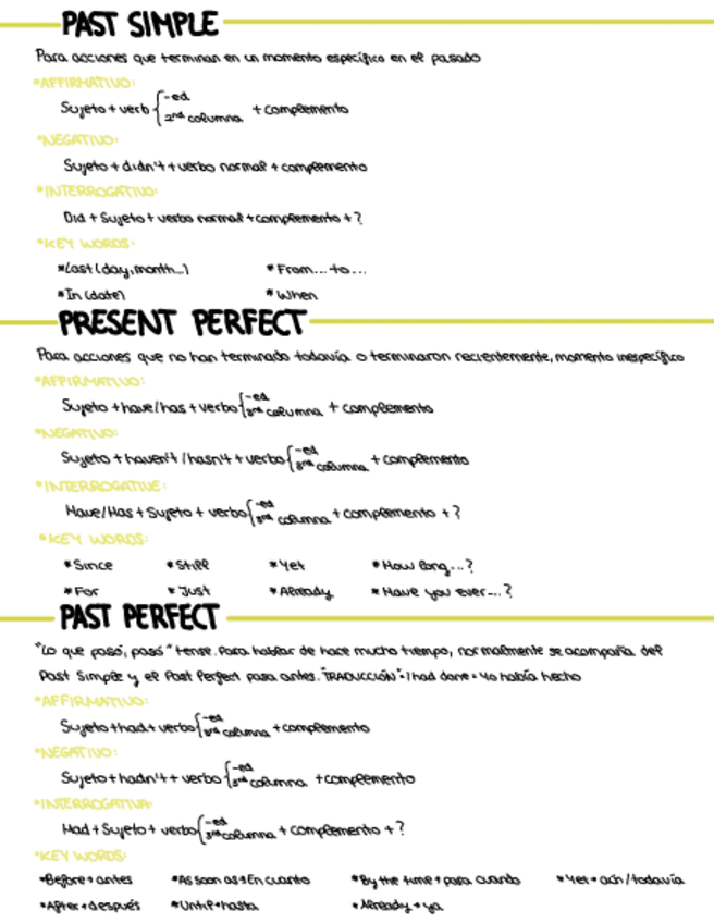 Apuntes completos. Vocabulario, Past Simple, Past Perfect, Present Perfect y Reflexive pronouns. Ejemplos y key words.