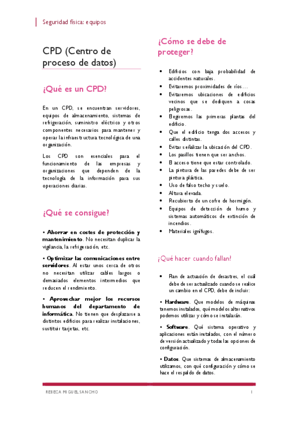 El documento trata sobre los Centros de Procesamiento de Datos (CPD), sus condiciones, requerimientos de seguridad física y los métodos de identificación para controlar el acceso.