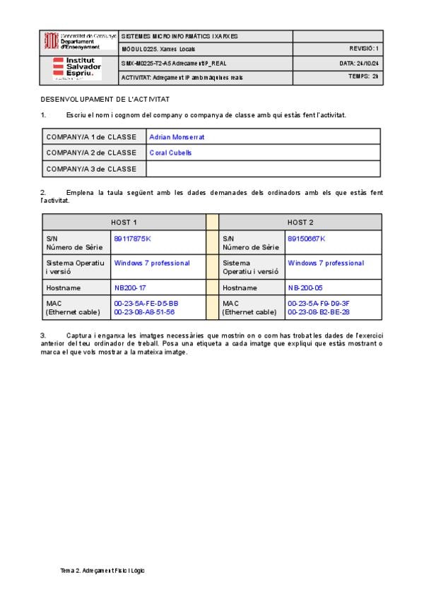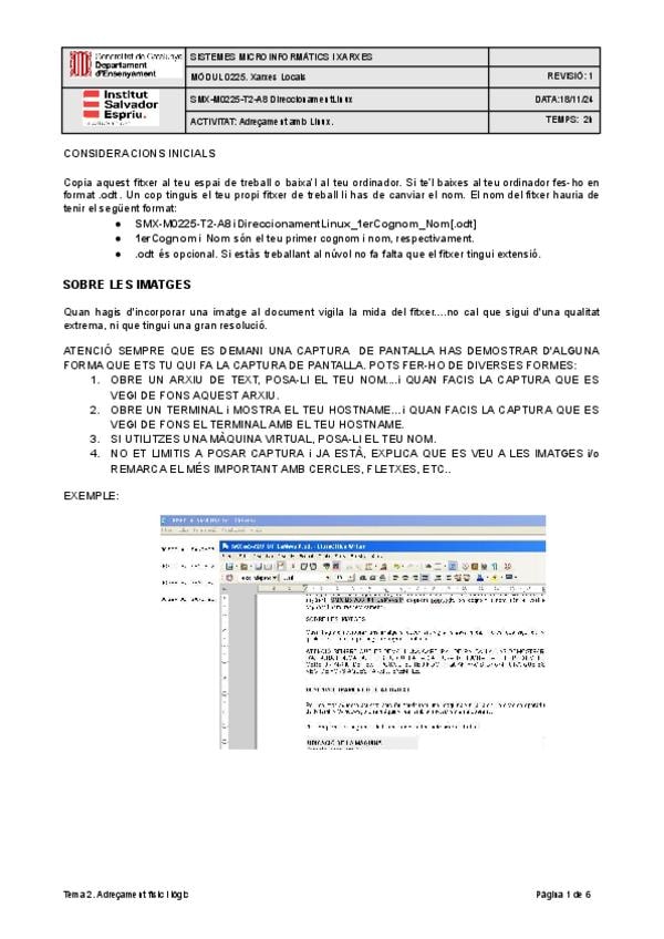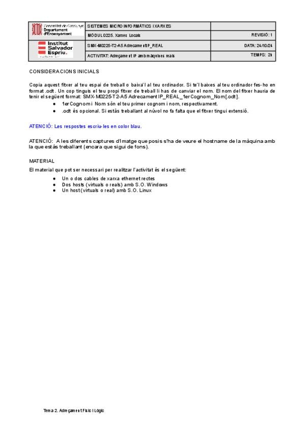 Enunciado de práctica sobre direccionamiento de red en Linux para el módulo SMX-M0225 (Xarxes Locals). Incluye: objetivos, material necesario (cables, switch, máquinas virtuales/reales), escenarios de trabajo, uso de Packet Tracer para simulación, configu