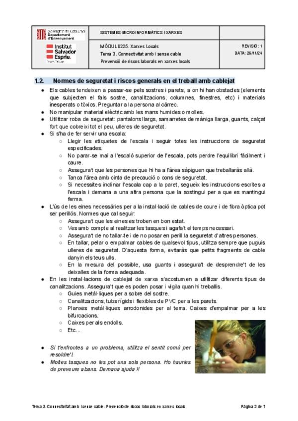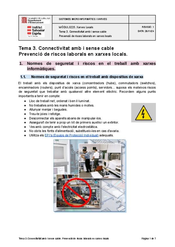 Guía sobre seguridad laboral y gestión de residuos en instalaciones de redes. Incluye: normas de seguridad con dispositivos de red, riesgos en cableado de cobre y fibra óptica (químicos, estillas, llum nociva), uso de EPIs y escaleras, prevención de incen