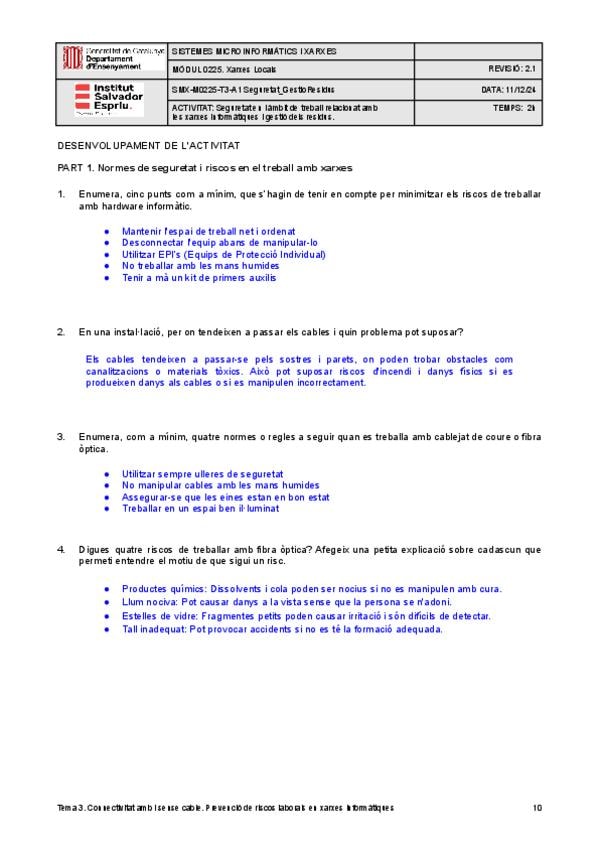 Práctica resuelta sobre seguridad laboral y gestión de residuos en instalaciones de red. Incluye: normas de seguridad con hardware, riesgos en cableado de cobre y fibra óptica, EPIs (Equipos de Protección Individual), componentes materiales de un ordenado