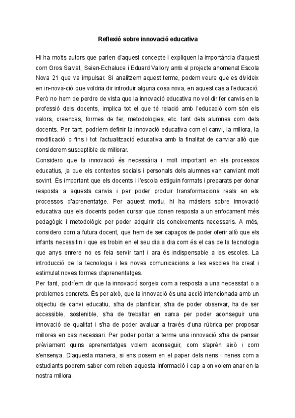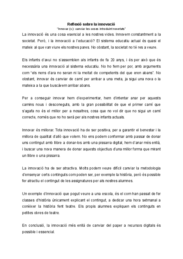 He publicado nuevos ejercicios de 1º Sistema Educatiu, Contextos Educatius a l'Etapa d'Infantil: Reflexio-sobre-la-innovacio.pdf