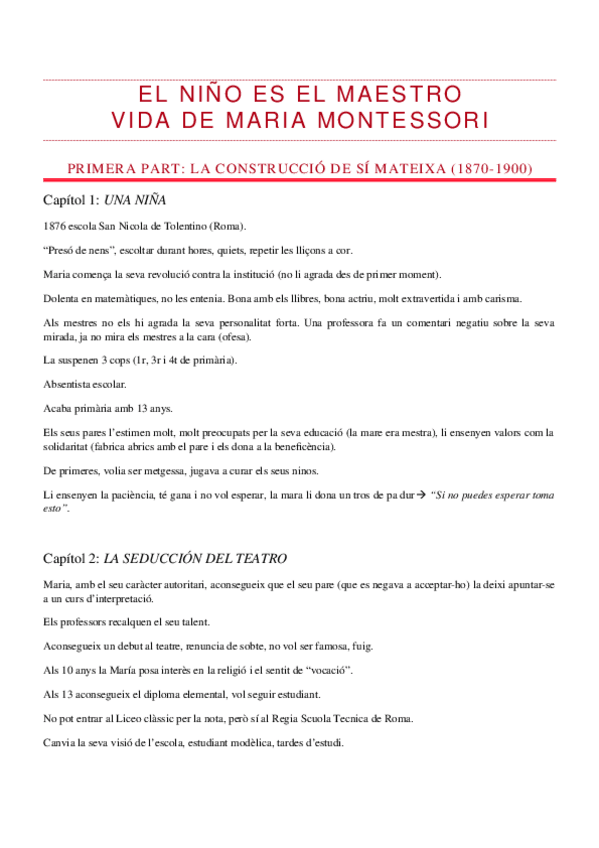Ressum per capítols del llibre "EL NIÑO ES EL MAESTRO, LA VIDA DE MARIA MONTESSORI"