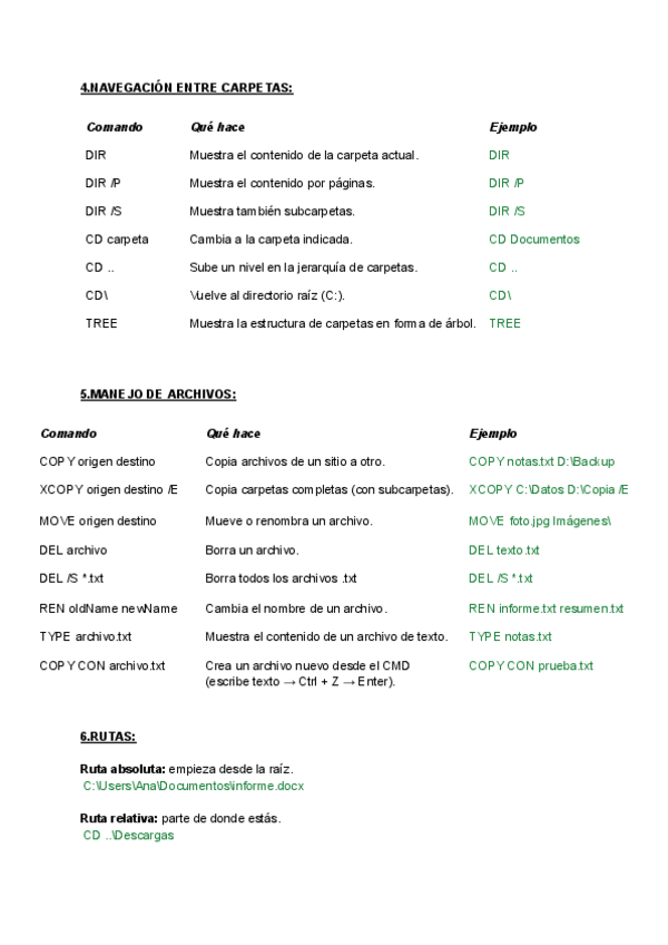 Apuntes de MS-DOS y CMD (Windows). Incluye todos los comandos vistos en clase con su sintaxis, explicación y ejemplos prácticos.