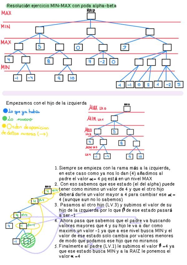 Resolucion paso a paso de un ejercicio MINMAX con poda alpha beta El que haya mucho texto es porque se explica detalladamente como se resuelve paso a paso