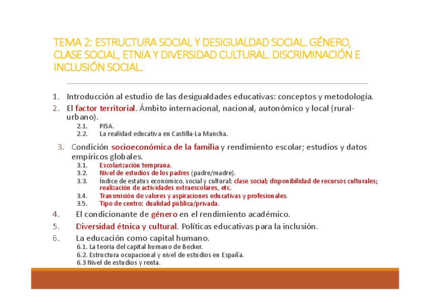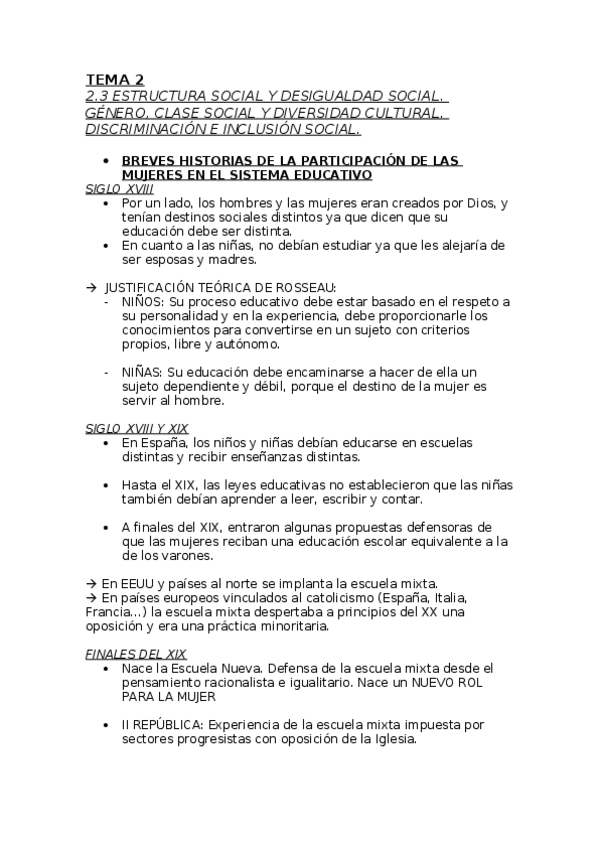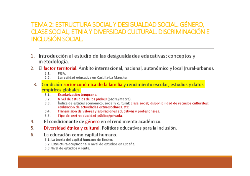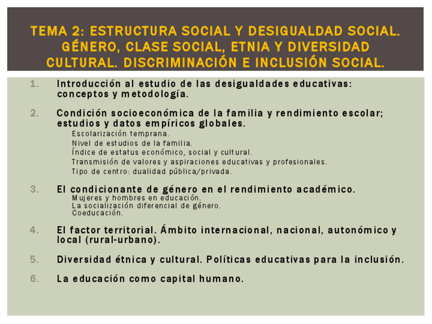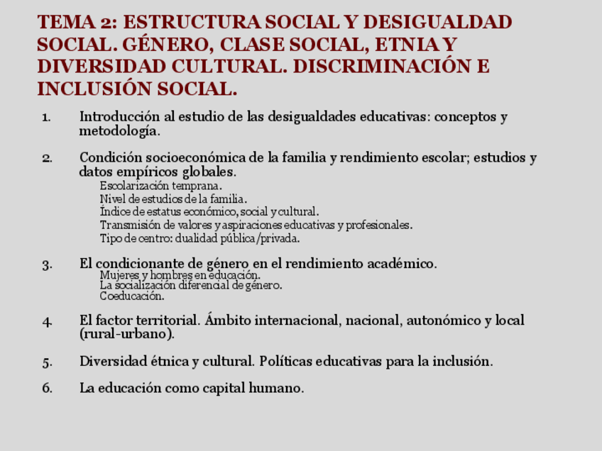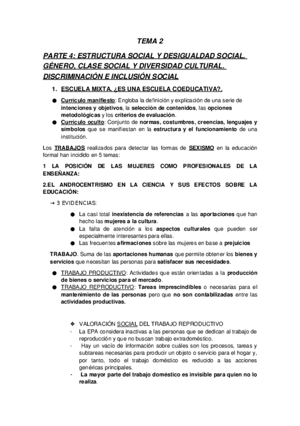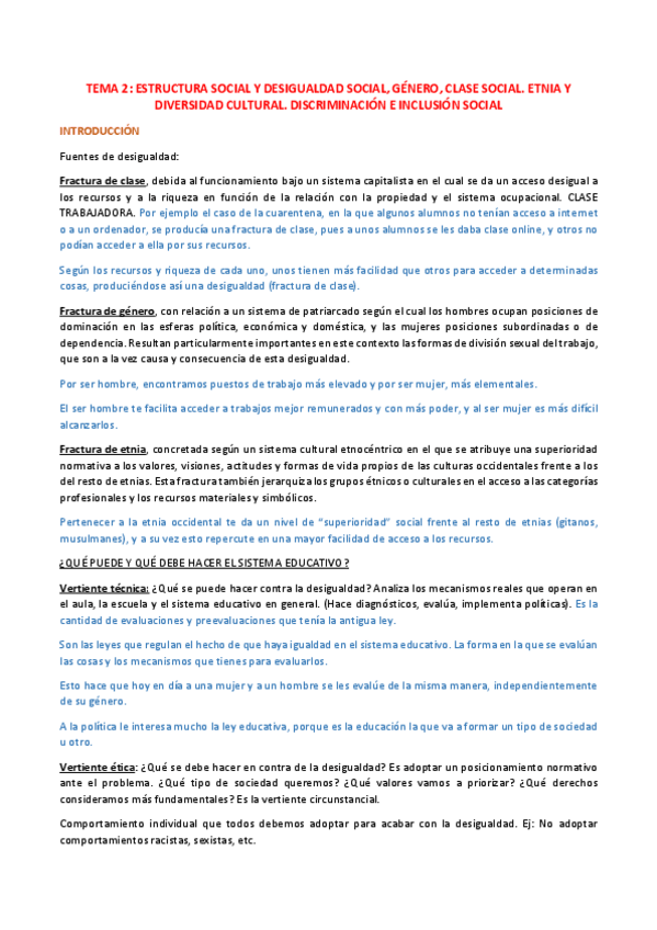 Tema 2. Estructura social y desigualdad social. Género, clase social, etnia y diversidad cultural. Discriminación e inclusión social.