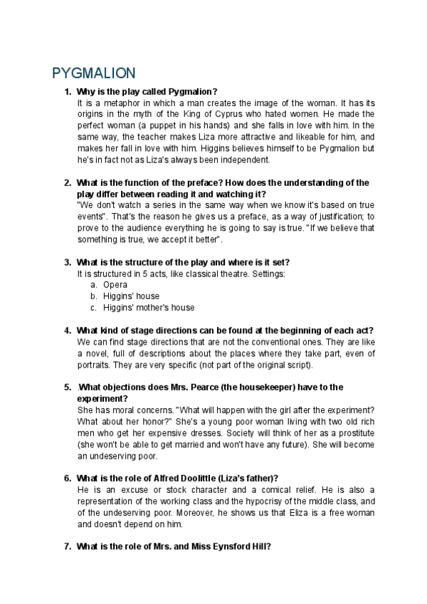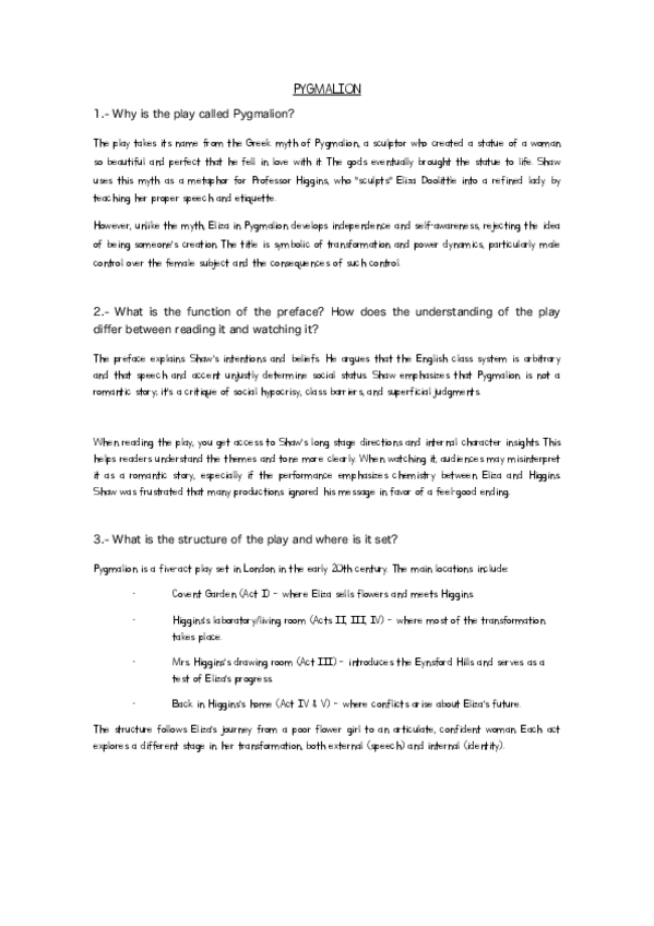 Este documento incluye las preguntas sobre pygmalion con sus respectivas respuestas. Subiré el documento completo con todas las preguntas del curso en diciembre.