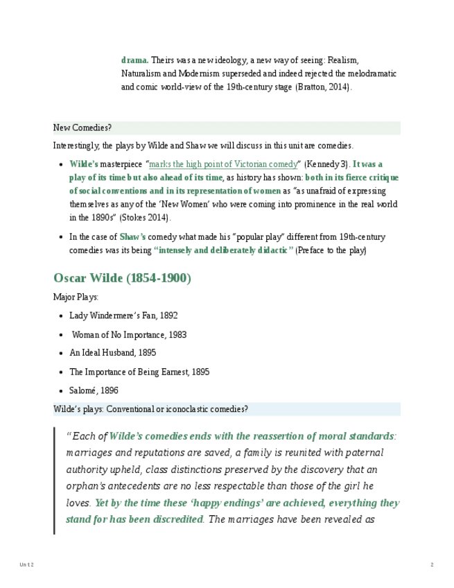 Unit 2. From the late 19th century comedy of manners to realism: Oscar Wilde and George Bernard Shaw