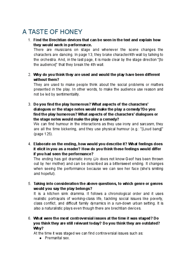 Este documento incluye las preguntas sobre 'a taste of honey' con sus respectivas respuestas. Subiré el documento completo con todas las preguntas del curso en diciembre.