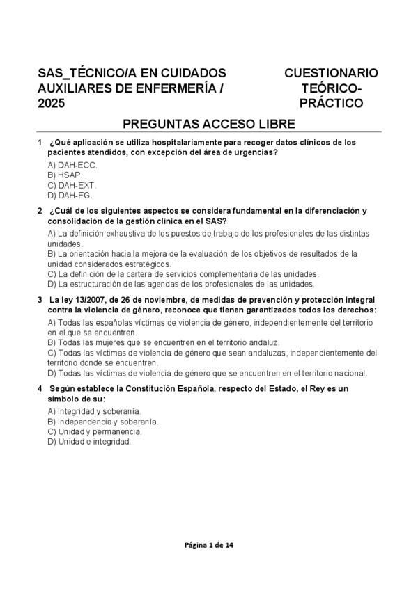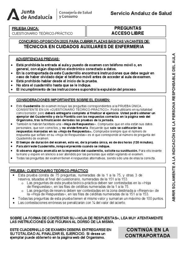 Examen oposiciones TCAE 2025 con respuestas. En este documento encontraréis el cuadernillo de preguntas junto con sus respectivas respuestas, para que podáis ver el tipo de cuestiones que se plantean y el nivel exigido en la prueba. ¿Seríais capaces de ap