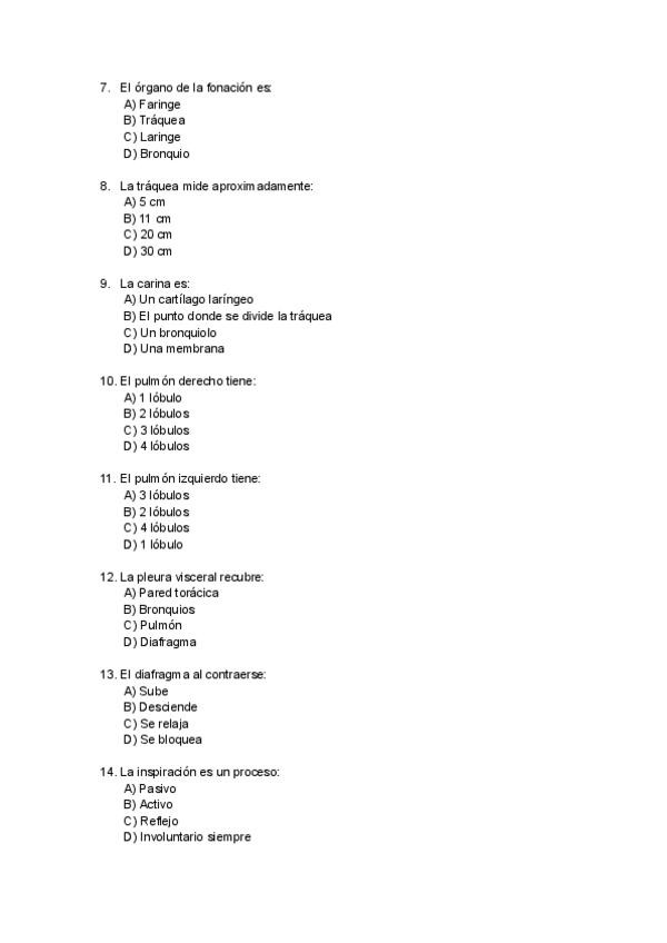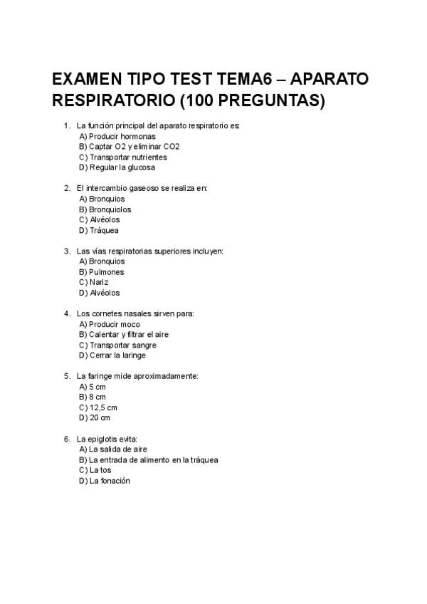 En este documento encontrarás un examen tipo test del aparato cardiorrespiratorio, compuesto por 30 preguntas con cuatro opciones de respuesta cada una. Al final del examen se incluye la plantilla de soluciones para facilitar la corrección y el autoestudi