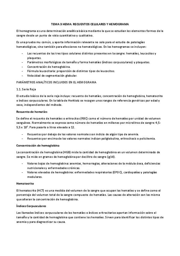 Resumen Unidad 3 Recuentos celulares: el hemograma, resumen técnica 80-20 y preguntas tipo test