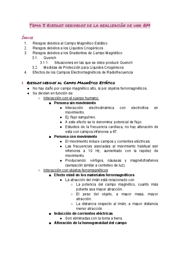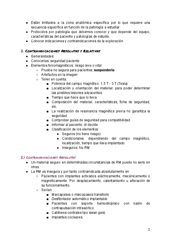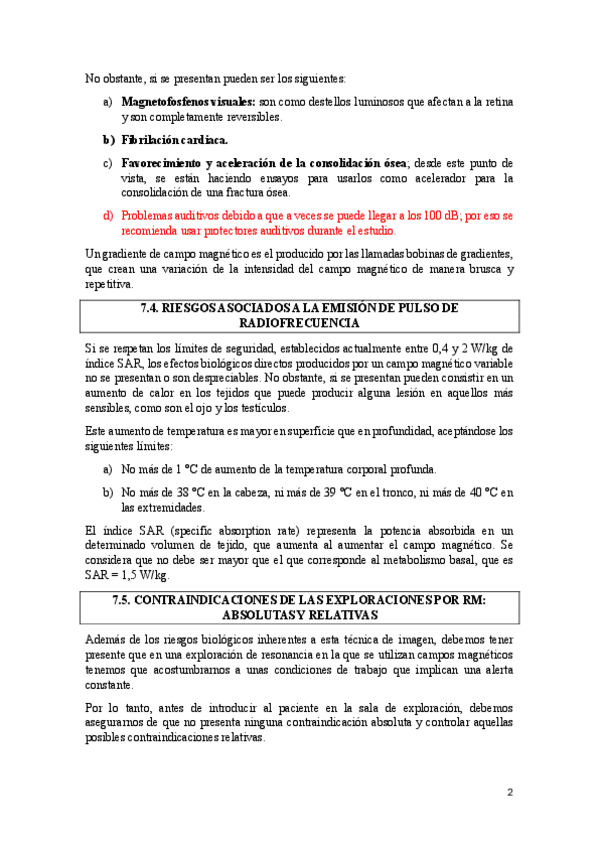 Daños derivados de los campos magnéticos estáticos. Riesgos derivados de la activación de los gradientes de campo magnético. Riesgos asociados a la emisión de pulso de radiofrecuencia. Contraindicaciones de las exploraciones por RM: relativas y absolutas