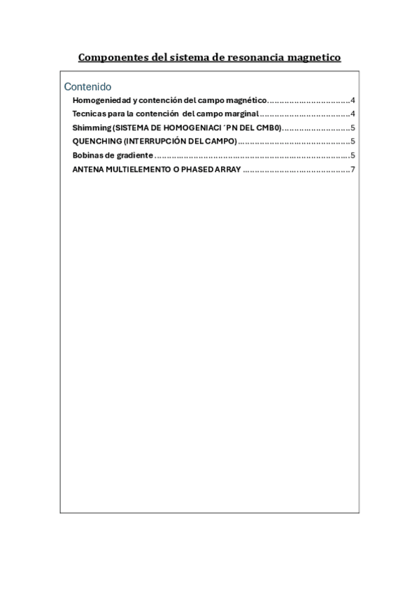 Contenido Homogeniedad y contención del campo magnético 4 Tecnicas para la contención del campo marginal 4 Shimming (SISTEMA DE HOMOGENIACI´PN DEL CMB0) 5 QUENCHING (INTERRUPCIÓN DEL CAMPO) 5 Bobinas de gradiente 5 ANTENA MULTIELEMENTO O PHASED ARRAY 7