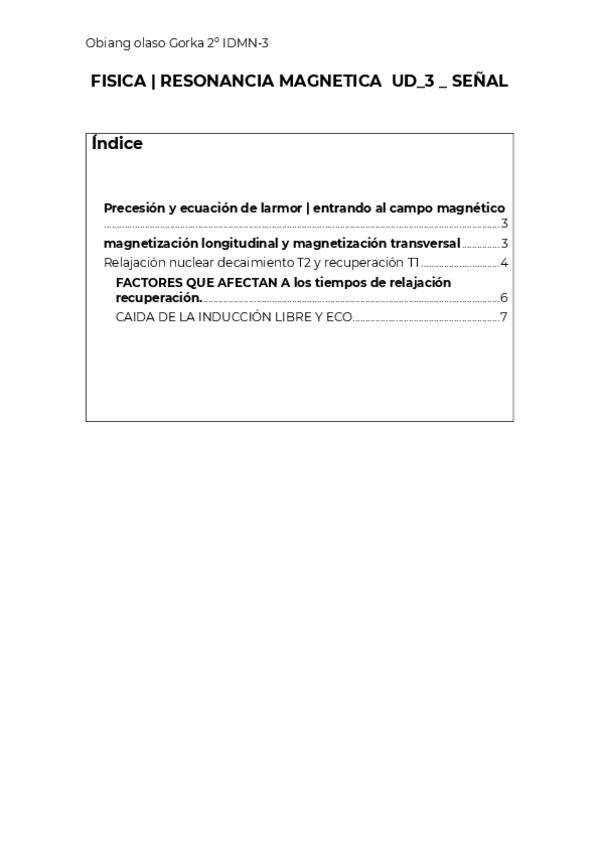 Precesión y ecuación de larmor | entrando al campo magnético 3 magnetización longitudinal y magnetización transversal 3 Relajación nuclear decaimiento T2 y recuperación T1 4 FACTORES QUE AFECTAN A los tiempos de relajación recuperación. 6 CAIDA DE LA I
