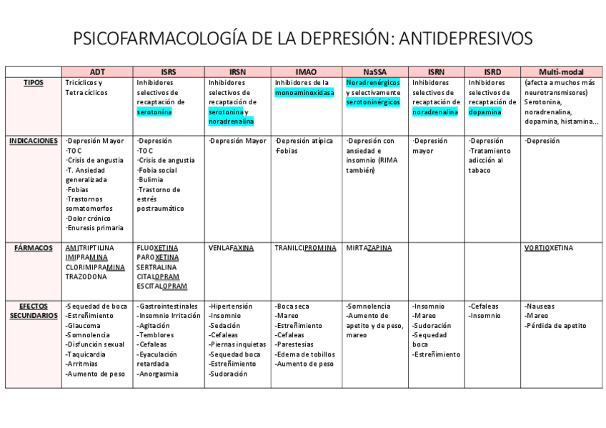 TABLA RESUMEN SOBRE LA PSICOFARMACOLOGÍA DE LA DEPRESIÓN (TEMA 2)