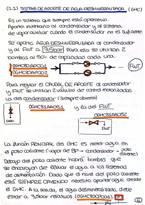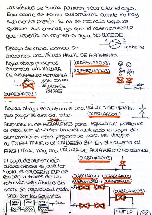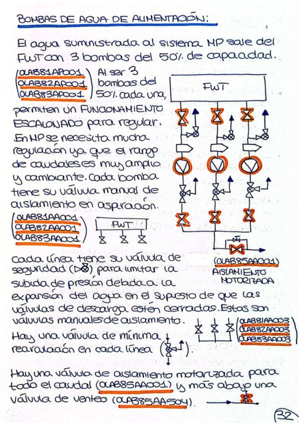 Todos los sistemas explicados con dibujos de los esquemas donde se opera. Los valores importantes de operación aparecen recuadrados. Código de color: · AZUL = Sistema o subsistema · NARANJA = Válvulas y bombas · GRIS = Datos o nombres importantes