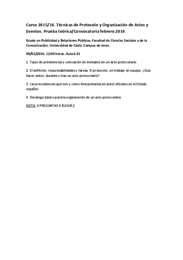 He publicado nuevos examenes de 4º TECNICAS DE PROTOCOLO Y ORGANIZACION DE ACTOS Y EVENTOS: examen 2016.pdf