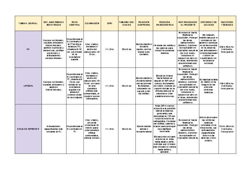 Os dejo una tabla con las proyecciones de la columna dorsal, lumbar, el sacro, el coxis, el tórax, el abdomen, de la cabeza, además de la cabeza a nivel facial y mandibular.
