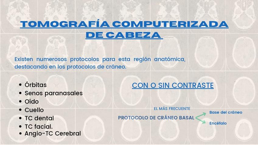 Protocolos sobre: cráneo, senos paranasales, órbitas, peñascos, cuello, tórax, abdomen, uro-tac, etc